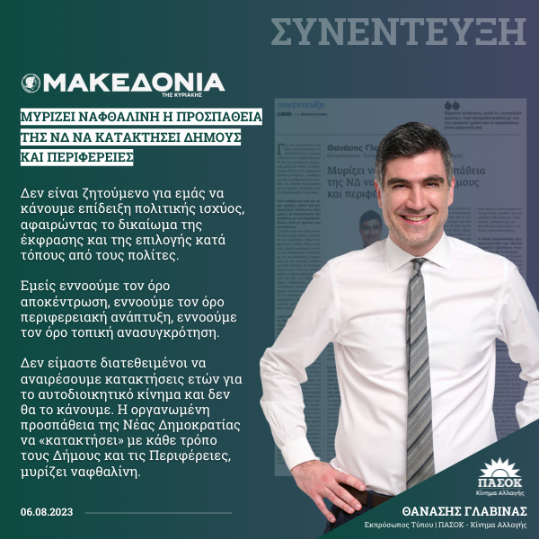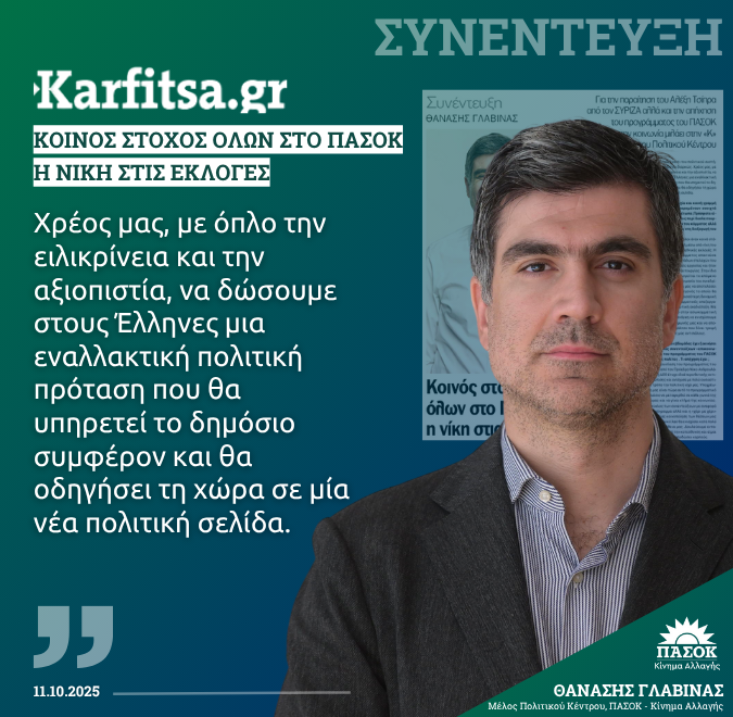 Ως «εγγύηση σταθερότητας» χαρακτηρίζει το ΠΑΣΟΚ-Κίνημα Αλλαγής ο Θανάσης Γλαβίνας στη συνέντευξή του στην εφημερίδα «Πολιτική».